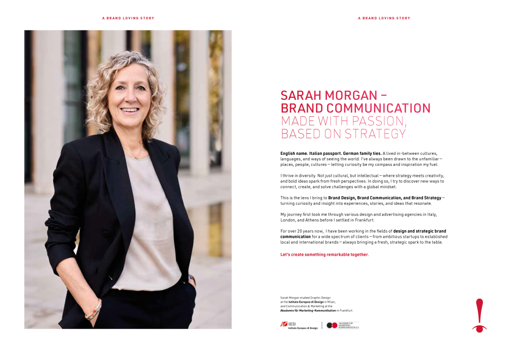 „Ho collaborato con Sarah Morgan a diversi progetti di grande portata: dai concetti di comunicazione interni e internazionali orientati al cliente, che coprono una vasta gamma di tipi di informazioni, alle offerte di gara per un complesso gruppo aeronautico. Sono rimasta impressionata dalla sua leadership, dal suo senso del dettaglio e dalla sua capacità di individuare trame narrative olistiche e sostenibili. Sarah è un‘esperta nel dare vita visivamente a storie basate sui fatti. Lavorare con lei è come una ventata di aria fresca creativa che ogni azienda dovrebbe provare.“
